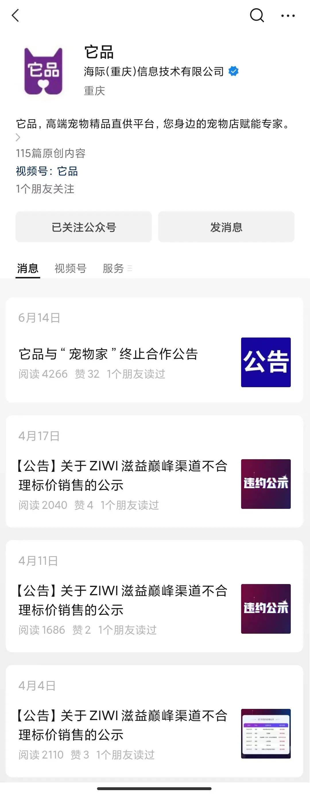 6月14日,主打“互联网+进口宠物商贸”的海际它品在公众号上发布了公告,称“近期,它品核实到客户‘宠物家’在较多渠道出售的ZIWI滋益巅峰产品价格低于在我司的进货价,其‘恶性竞争’的行为极大地扰乱市场秩序和侵害其他商家的合法权益。”并宣布,“它品已终止与宠物家ZIWI滋溢巅峰品牌的合作”。