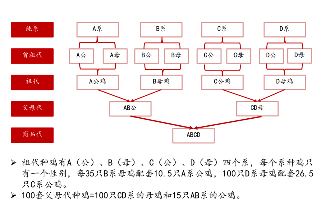 “这个产业是从源种开始的,源种下一代就是祖代。因为源种的规模是很小的,而且很贵,你不可能把源种的鸡拿去生产商品肉鸡,要把规模扩大到祖代。祖代一个品种是由4个品系(A、B、C、D)组成的,四个品系不一样,有的是生长速度快,饲料转化率好,有的是产蛋性能好,有的是产肉性能好。通过杂交,在终端商品代肉鸡上体现出来优势,它的性能要最优、生产效率要最高。”肖凡表示。