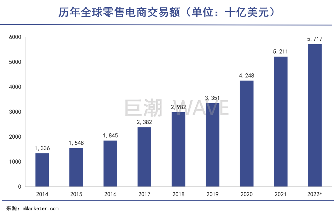 相关机构发布的数据来看,2022年全球零售总额超过27万亿美元,其中,零售电商销售额约为5.7万亿美元,占比超过21%。