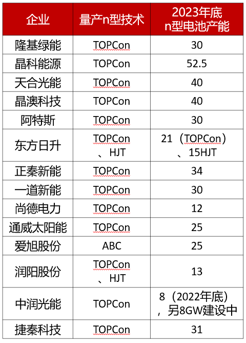 头部企业N型电池产能情况(单位:GW):