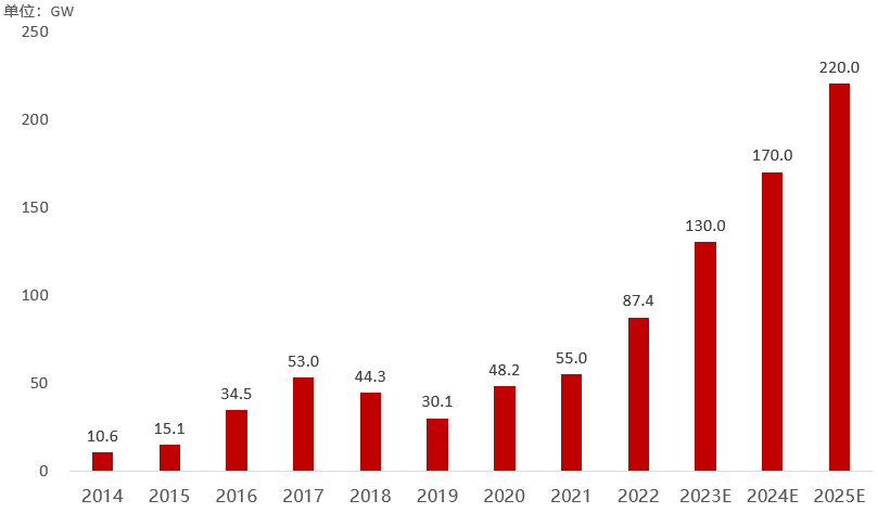 从需求端看,中国光伏业协会和首创证券预测,2023年全球光伏新增装机量预计为350GW,国内装机量将同比增长46%,达到130GW。