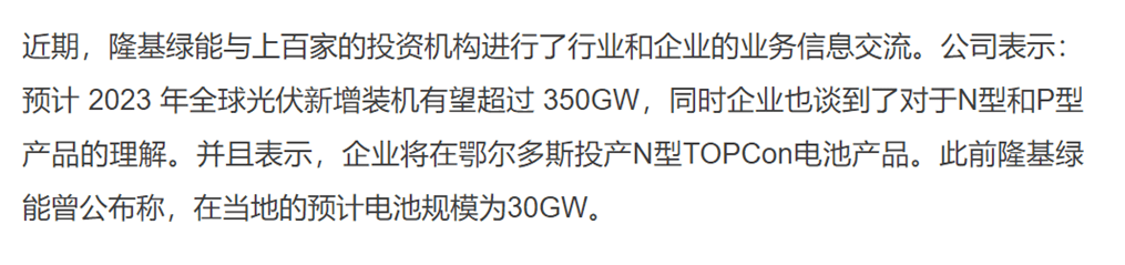 TCL中环在去年12月25日在互动平台表示,截止2022年底,TCL中环共有合计140GW,其中N型产能约105GW;预计到2023年底,总产能将达到180GW,N型产能将达到140GW。