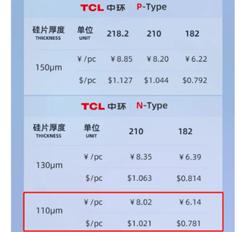 2022年5月19日,TCL中环推出N型硅片,硅片厚度减薄至130微米。今年3月,根据TCL中环硅片报价显示,N型硅片已经再度减薄至110微米,并且在价格上低于P型硅片,实现了NP同价。