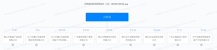 而从冯辉强的投资版图上看,其在11家企业担任股东(其中2家已注销),包括鹤山市辉腾项目投资、广东江逸建设工程、江门市蓬江区骏景湾物业管理、鹤山市半岛骏景湾投资、鹤山市永富投资、鹤山市骏强产业投资等等公司。