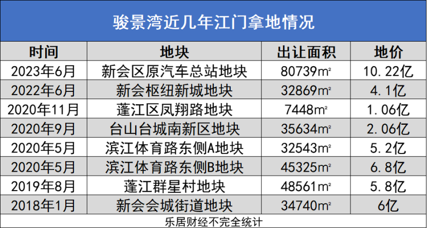 据乐居财经不完全统计,骏景湾集团近6年在江门拿地8宗,总斥资41.24亿元,主要集中于新会、台山等区域。