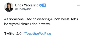 5月底,亚卡里诺就发布过一条推文:“作为一个习惯穿4英寸高跟鞋的人,让我们明确一点:我不会摇摇晃晃。”(温馨提示,4英寸约等于10厘米。)上任之后,亚卡里诺又发推特“让我们坚持自己(不管是4英寸还是平底),共建推特2.0”。此处“坚持自己”英文dig our heels in直译是“把鞋跟踩进去”,亚卡里诺玩了个双关。