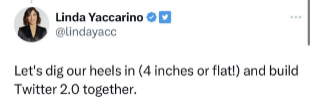 亚卡里诺在信中说“推特的使命,是成为世界上最准确及时的信息员,和全球城市广场”,并强调“这不是一张空头支票”。同时,她在信中对员工说:“据我所知,你天生就是干这个的”,在结尾,她高呼:“这就是我在这里的原因,和你们在一起。”