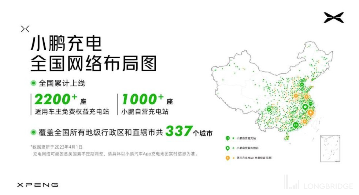 而在补能网络建设方面:截至 2023 年 4 月 1 日,小鹏汽车在全国已累计上线 2000+ 座充电站,其中自营站共计 1000+ 座(超充站 800 座)。