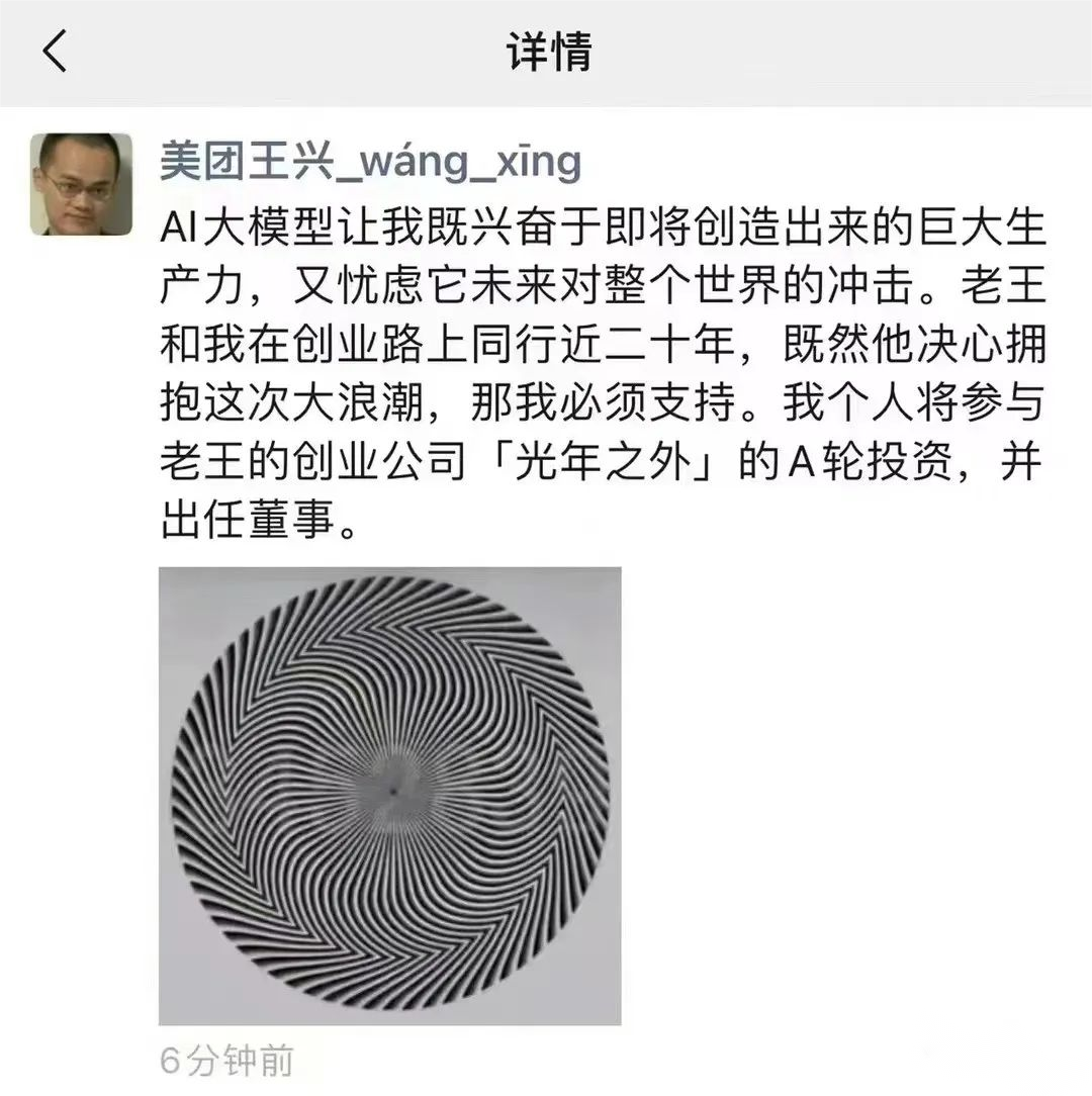 在王慧文宣布创立光年之外后,王兴以个人身份参与了A轮融资,并出任董事。“AI大模型让我既兴奋于即将创造出来的巨大生产力,又忧虑它未来对整个世界的冲击。老王和我在创业路上同行近二十年,既然他决定拥抱这次大浪潮,那我必须支持”。此后,在美团财报电话会等场合里,王兴也表达过对AI的兴奋——这是属于创业者的敏感,或许也是清华理工男的基因所致。