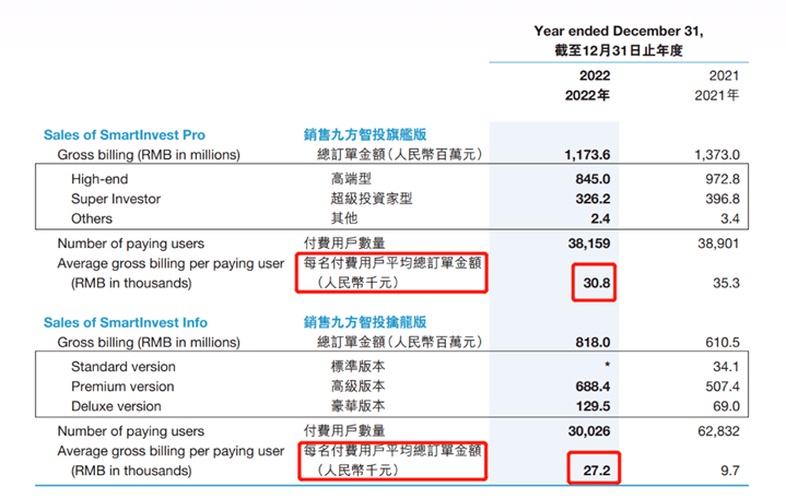 九方财富2022年年报披露,九方智投旗舰版(高端投教服务)及九方智投擒龙版(金融信息软件服务),按付款金额计的退款率攀升至22.7%及24.3%,即约4名-5名付费用户中就有1人退款;而2021年这两项产品及服务的退款率分别为16.3%及15.8%。