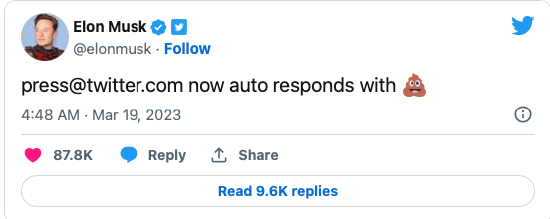 此外,雅卡瑞诺也在努力修复马斯克带来的媒体关系裂痕。在马斯克入主推特之后,他直接解散了推特的公关团队,让自己成为推特唯一的发声渠道。因为不满媒体批评报道,马斯克与媒体的关系非常恶劣,甚至让推特自动回复媒体咨询邮件“一坨大便”。在此前的“政府资助媒体”标签问题上,马斯克也和NPR等公共媒体的关系持续恶化。