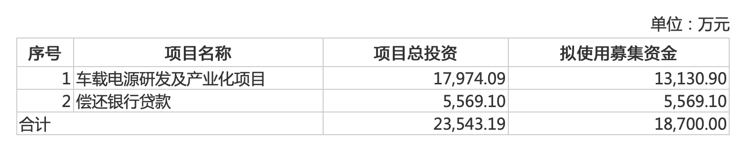 具体来看,公司对车载电源研发及产业化项目的投入金额没有变化,但光储逆变器研发及产业化项目消失了,偿还银行贷款的资金也从1.3亿元降至5569.10万元。