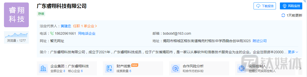 2021年12月,第三轮底价调整为5.52亿元。不过,第三次终于成功了,受让方为广东睿翔科技有限公司(下称“睿翔科技”)。据天眼查显示,睿翔科技成立于2021年11月12日,法定代表人为黄建忠,注册地址为广东揭阳。从时间上来看,睿翔科技成立时间和交易时间很接近。更为巧妙的是,睿翔科技注册地与上市公司实控人、董事长吴潮忠正好都是广东揭阳。