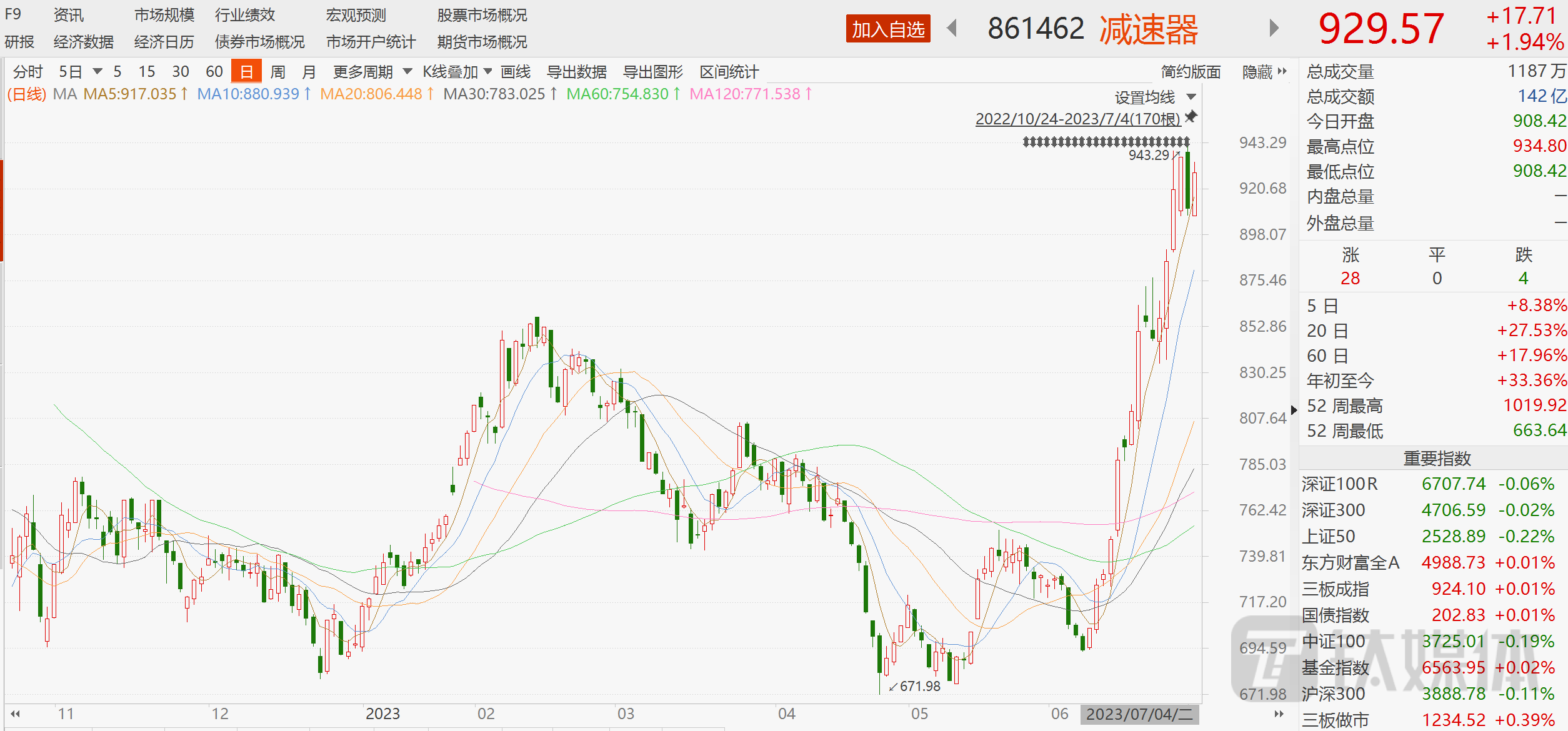 在上述相关消息的连续催化之下,A股减速器概念板块出现猛涨。从K线图上来看,减速器概念指数从6月9日开始就不断上涨,指数从600点涨到900多点,涨幅超50%。