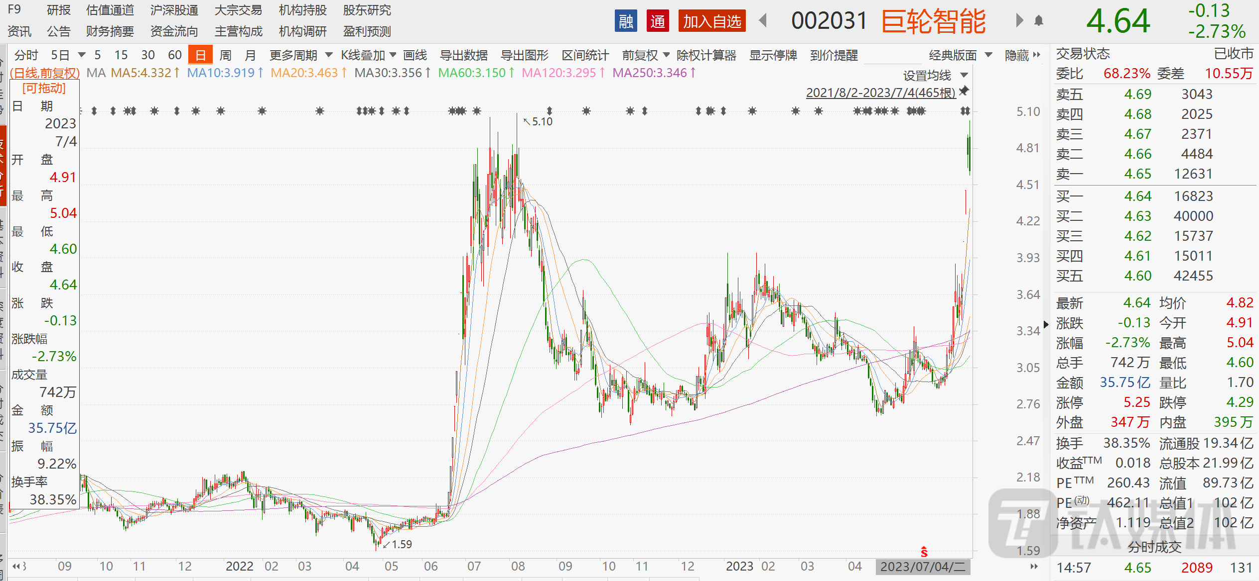 随后,2022年6月-7月,公司经历一波大涨,上述4元多买入的股民应该解套了。不过从2022年8月开始,公司股价就又掉头向下,从5.1元跌到2022年10月的2.6元,不到三个月又几乎腰斩。而在今年6月中旬,随着特斯拉人形机器人、减速器等概念卷土重来,巨轮智能的股价才又迎来新一波的上涨。