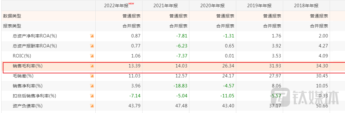 更让人担心的是,公司的毛利率却还在逐年下降,从2018年的接近34.3%,连年下降至2022年的13.39%。