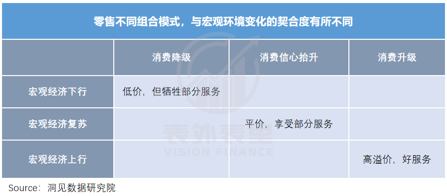 可以看到,零售行业作为宏观经济的晴雨表,在不同的宏观周期里,会托举出不同的零售模式。