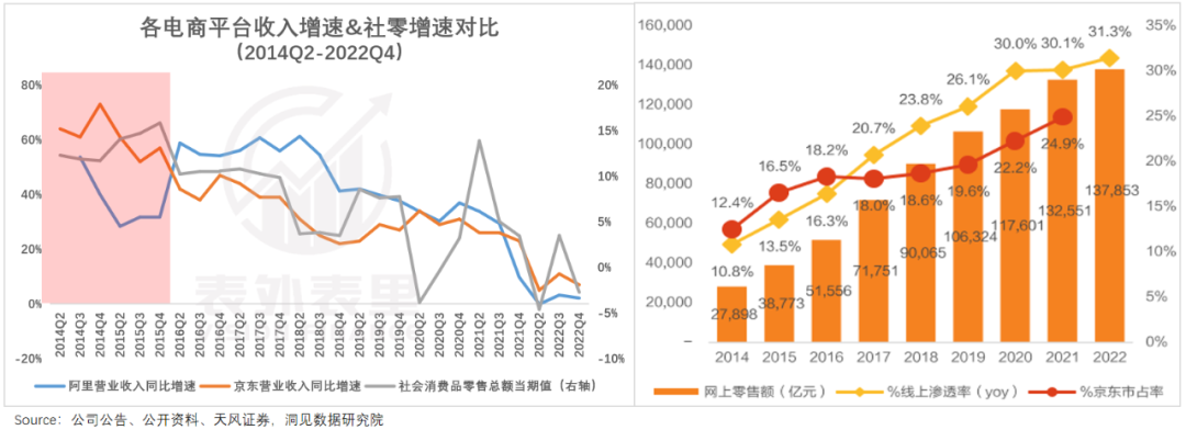 投射到电商行业上,主打品质化、优质服务的京东,吃到了更多红利:收入增速不仅大幅跑赢社零,还远高于阿里,市场份额也节节攀升。(当然,也有平台发展阶段不同的影响。)