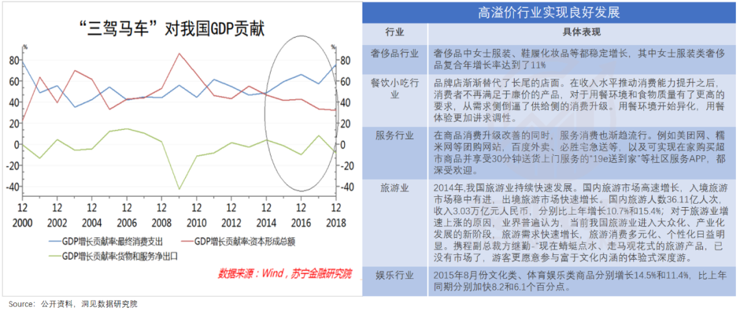 比如,2014年前后,随着国内经济高速发展,居民消费信心空前高涨,消费逐渐成为拉动经济的“第一大马车”,不少溢价较高的品类与行业也因此乘风而起。