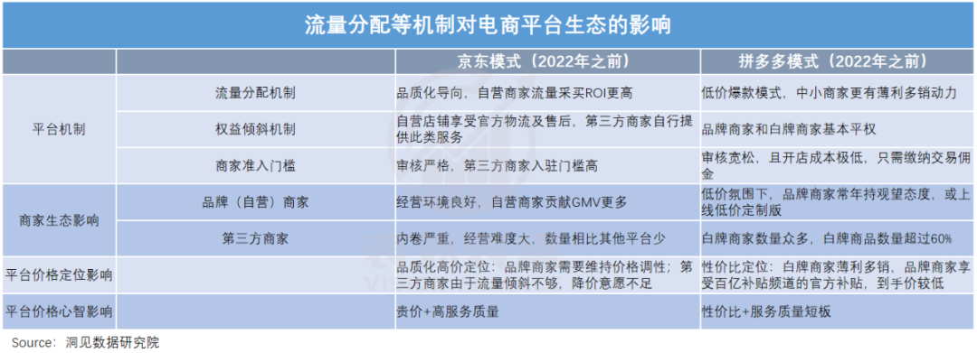 如下图,在品质和低价两种主张下,京东和拼多多在流量分配、商家权益倾斜机制和准入门槛上,做出了截然不同的选择,导致“品质高、价格贵”的商家更适合在京东生存,而拼多多则形成了“便宜才是硬道理”的丛林法则。