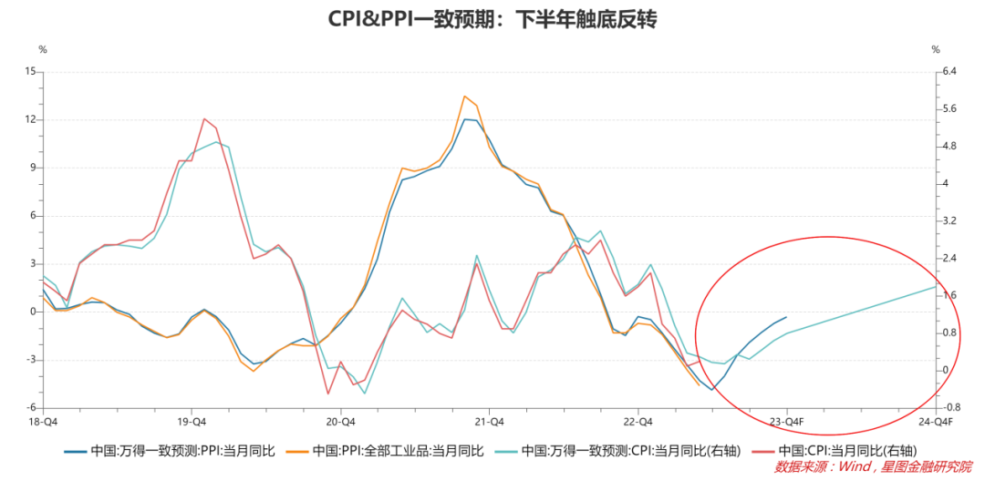 在上述迹象的驱动下,市场开始预期2023Q2为本轮工业企业盈利底部位置,2023Q3企业利润有望触底回升。从CPI和PPI的市场一致预期看,均为6月份触底,7月开启反转向上走势。股市提前反映基本面预期的改善,指数触底回升顺理成章。