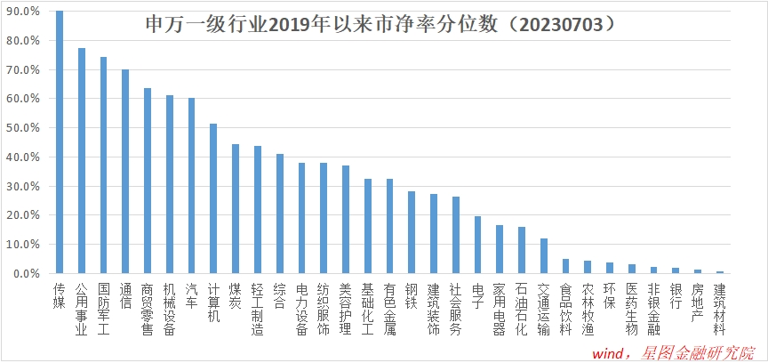 先从安全边际的角度做一轮行业初筛。从2019年以来的市净率分位数看,截至2023年7月3日,市净率分位低于10%的行业有建筑材料、房地产、银行、非银金融、医药生物、环保、农林牧渔和食品饮料等共8个大类行业。