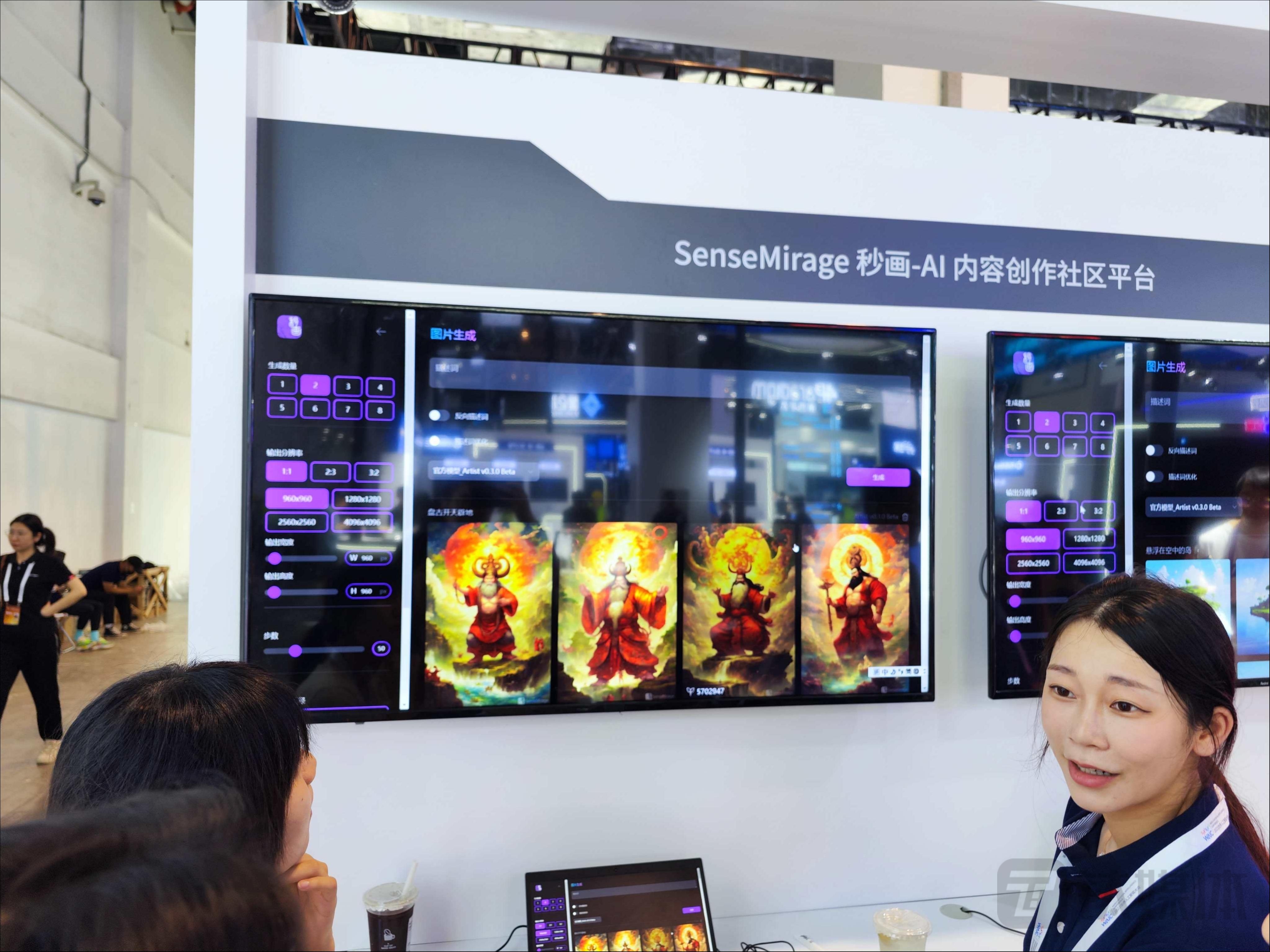 已经参与六届WAIC大会的商汤科技,则在今年现场展示AI 文生图的商汤秒画SenseMirage平台能力,以及可演示 AI 大模型平台商汤商量。而且商汤还搭建了20平方米左右的智慧篮球场,通过摄像头动作捕捉以及 AI 算法实现计数功能,畅享智慧运动的精妙乐趣。