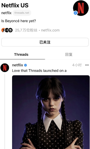 刚才提到的Netflix美国(Netflix US)这个账号,在Instagram的粉丝量是3300万,今天12点半时Threads已经有25.7万粉丝——距离Threads上线也就5个小时左右。