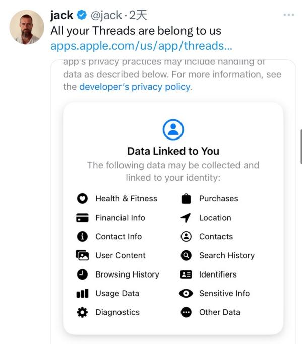 推特创始人杰克·多西(Jack Dorsey)两天前发推,截图了Threads在苹果应用商店上的隐私声明,其中显示Threads可能收集用户的健康运动、通讯、浏览历史、敏感信息等各种信息。“你所有的Threads,都属于我。”多西模仿Threads说道。马斯克也在这条信息下表示赞同。