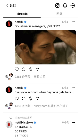 在App正式上线几小时内,多个企业官方号就已经出现在Threads。比如《纽约时报》、《华盛顿邮报》等媒体账号,以及Netflix、Spotify等企业账号。而且不少账号都挺活跃,Netflix美国的账号发了不少表情包,还问各位运营同行感受如何,大家纷纷表示:又多了一个平台,累啊。