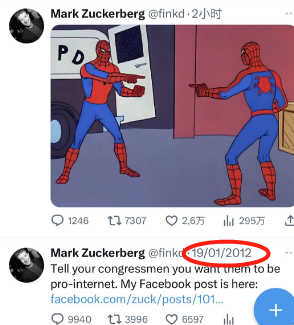 Meta老板马克·扎克伯格还发了条推特,没有文字,就是个图:俩一模一样的蜘蛛侠指着对方,都很惊讶。