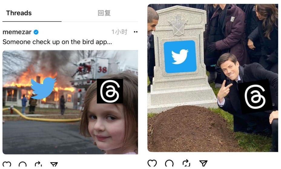 再如推特在大火中燃烧,Threads对着镜头满意地笑;或者推特直接入土为安,Threads在一边欢乐比“耶”和墓碑合照。