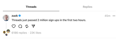 至于小扎能不能成功让超过八分之一的Instagram用户转化到Threads,还是未知数,目前势头不错。扎克伯格自己发Threads宣布,头两个小时,该平台就吸引了200万注册用户。