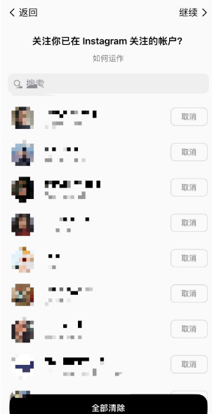 Threads可以用Instagram登录,用户可以选择沿用在Instagram上的用户名、头像、自我介绍等。并且,在注册阶段,你可以一键关注所有在Instagram上关注的人。