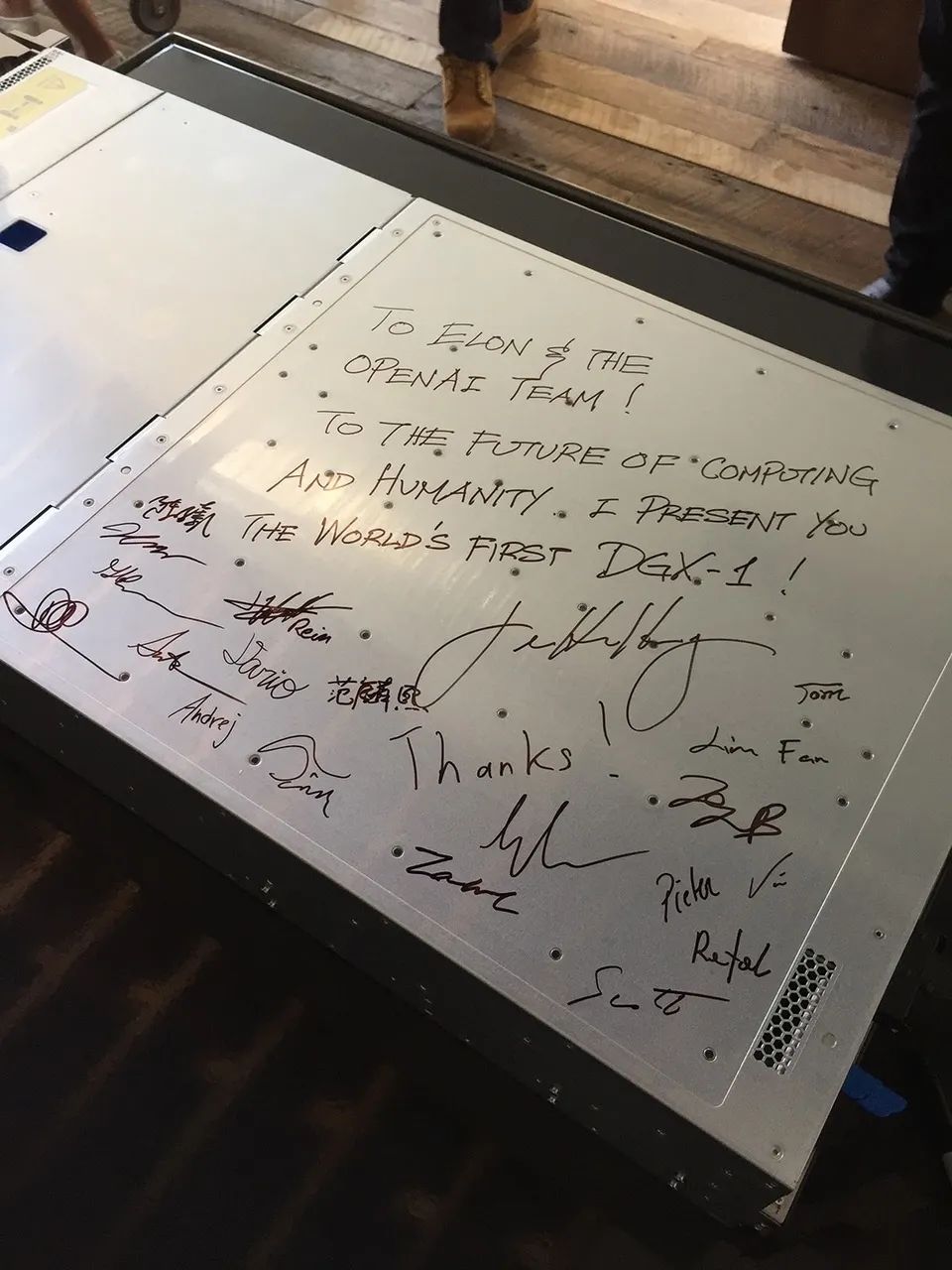 2016 年 8 月,黄仁勋带着一台装载了 8 块 P100 芯片的超级计算机来到了刚刚成立不到一年的 OpenAI 办公室。他在机箱上写下,「致埃隆和OpenAI团队!为了计算和人类的未来,我将世界上第一台DGX-1送给你们!」