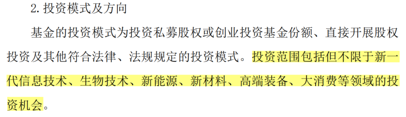 前述贵州茅台参与设立产业基金的公告中,也专门提及投资方向为“生物技术、新一代信息技术、新能源、新材料、高端装备、大消费等领域”。