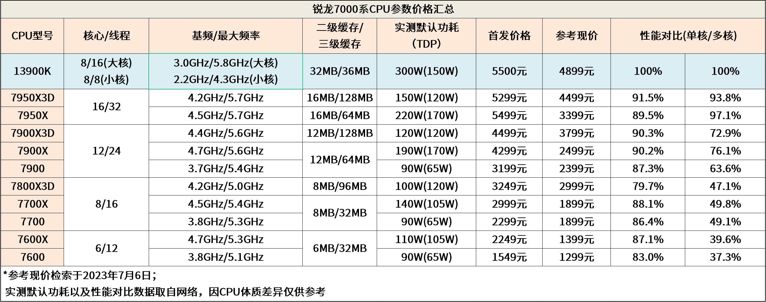 相较于13900K的300W爆炸级功耗,200W出头、性能又没差多少的7950X真的是非水冷生产力用户的极佳选择。同时,其他型号的锐龙7000系CPU都有着不同程度的降价幅度,大家可以参考下图。