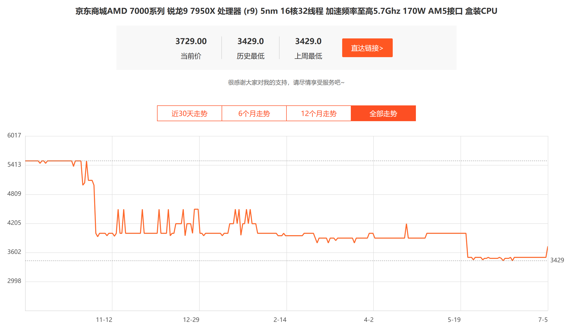 锐龙7000系CPU首先在2022年双十一期间开始大降价,7950X的降价幅度更是高达1000元!2023年618前夕,7950X降至3499元后稳定至今。想到其5499元的首发价,让我有点同情首发用户了。