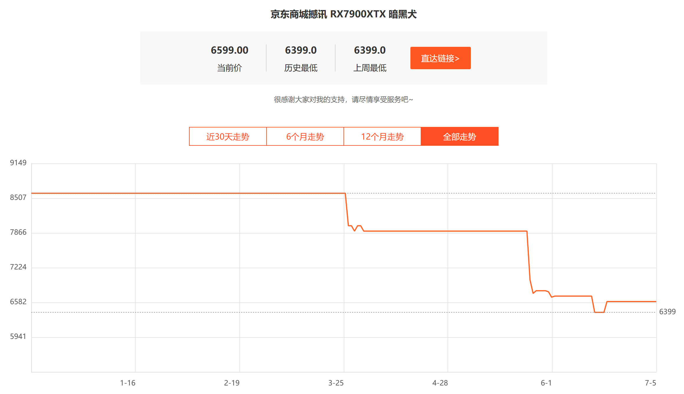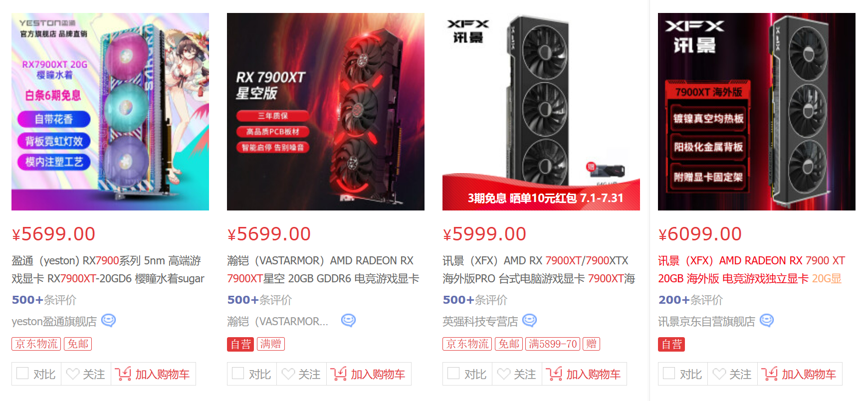 说到降价,RX 7900系显卡当然也不会落下。竞品RTX 4080还在八九千的价位居高不下时,7900XTX在2023年3月末率先作出价格调整——破八千大关。618期间它再破七千大关,直接对准4070Ti作出降维打击。