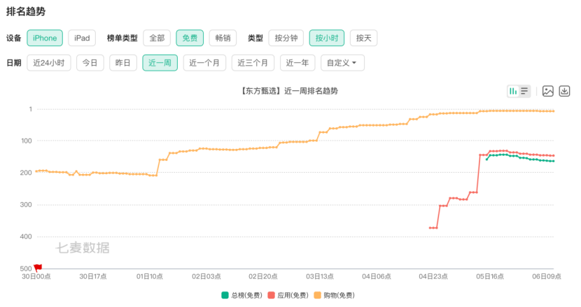 动态数据方面,借鸡生蛋的效果平平。据七麦数据显示,自从7月4日官方发布自建应用直播后,东方甄选App在iOS下载的总榜(免费)、应用(免费)、购物(免费)上从没有位次,最高分别来到第144位、第132位、第7位。