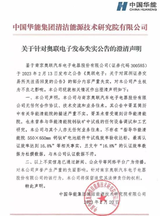但是,华能清能院的澄清公告则指出,胥某未曾受邀到访华能清能院,也未曾参与华能清能院钙钛矿中试线的任何设备调试和工艺研究,华能清洁能源研究院与其个人亦无任何业务往来。不存在“指导华能清能院550×650mm钙钛矿电池组件中试线效率验收达标,最高认证效率达到16.8%”等相关事实。