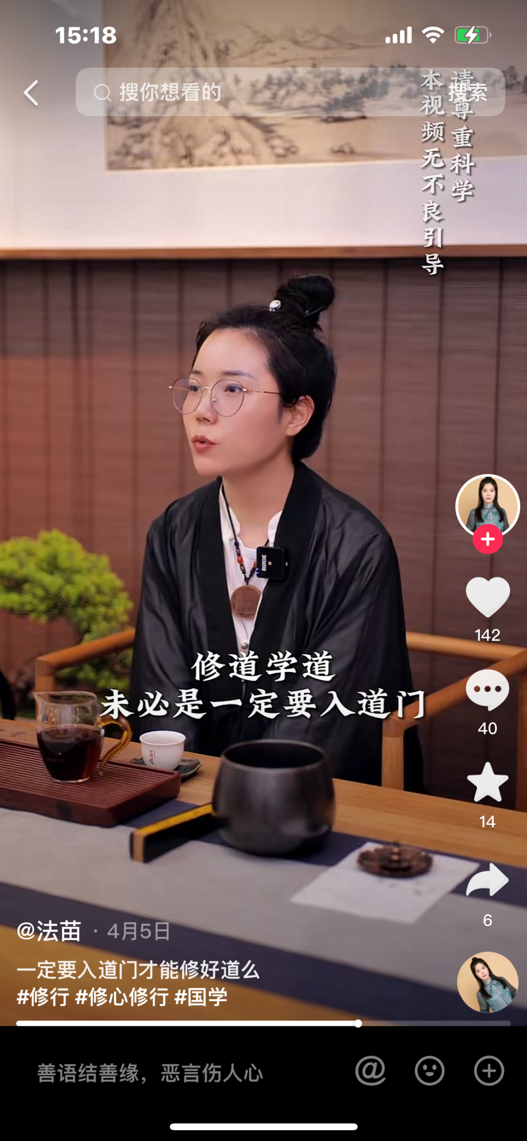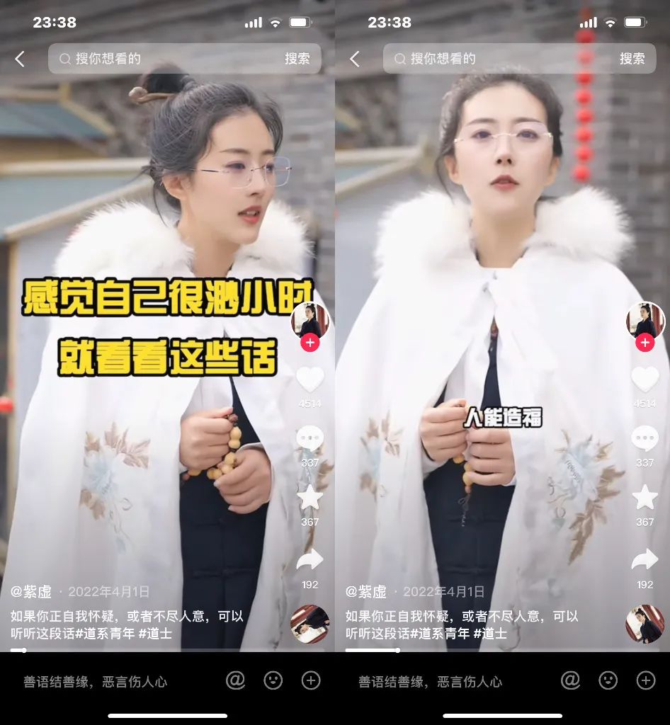 这类短视频以心灵鸡汤为核心,以道士口播、画外音或搞笑段子为窗口,传达对于现实、人生、工作、感情、人际关系等的正能量。这类短视频的特点是,切中当代人迷茫、压力、孤独和焦虑的精神痛点,以道士之口表达和传递一种对生活的坚持和向往。为“我为什么如此活着”和“我应该如何活着”找到一个理论支点。这类短视频借用道文化之口,通过心灵按摩传递出的内容大多都是奋斗、积极、善良等普世价值观,非常容易激发出人们的精神共鸣。