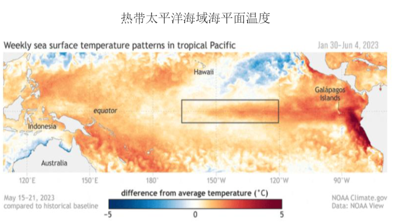 注:1月底至6月初,“NINO-3.4 区域”的关键监测区域逐渐变得比平均温度高(来源:NOAA)