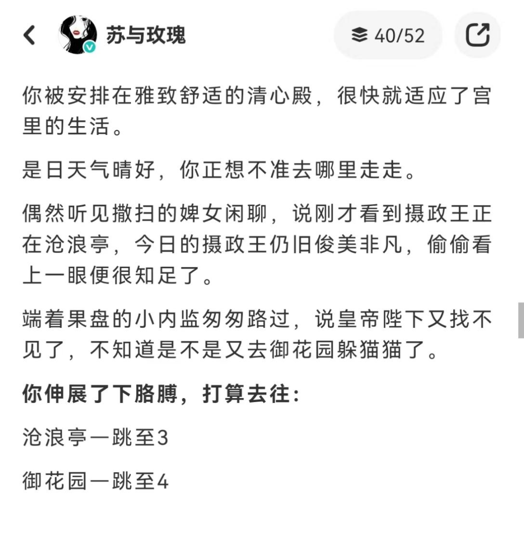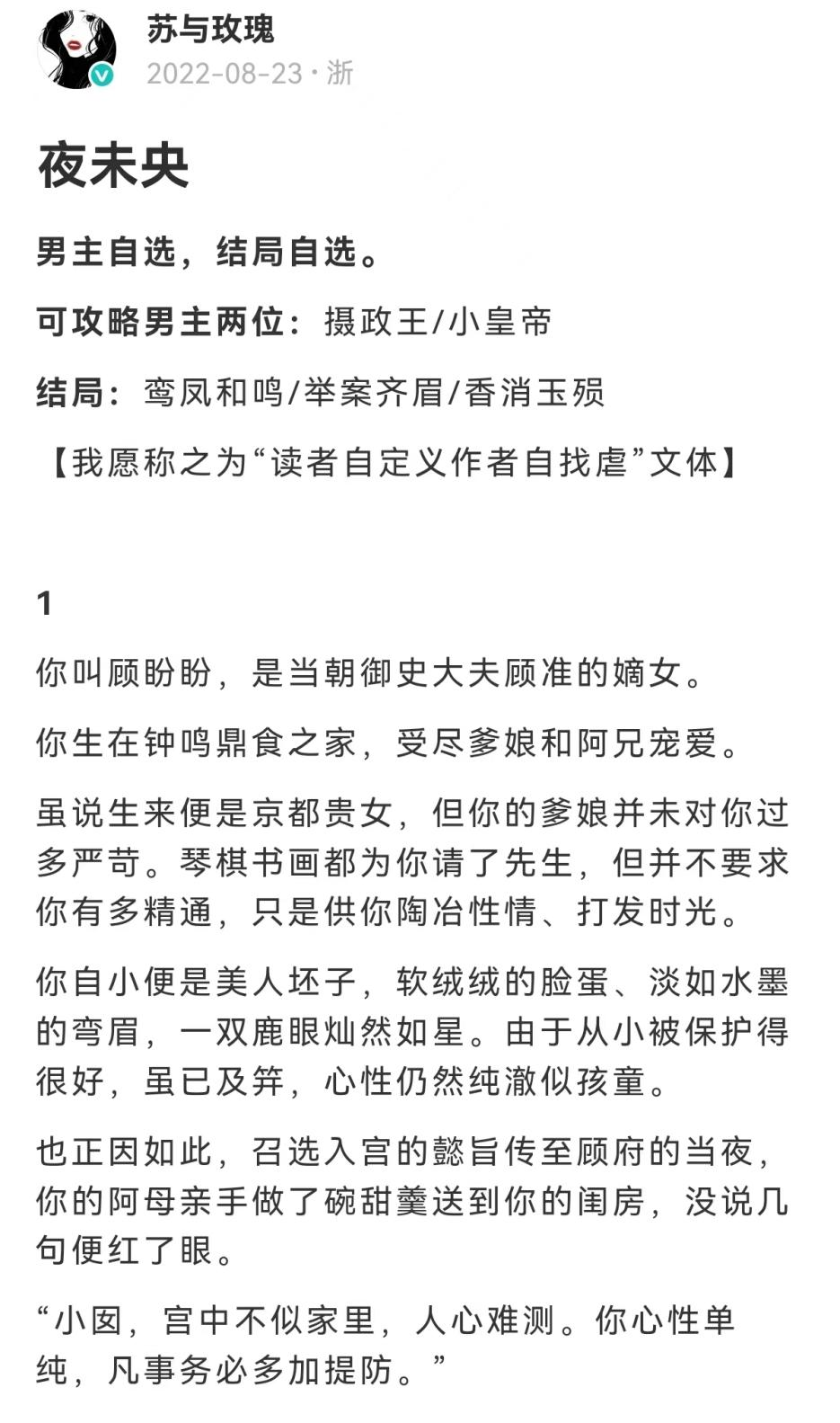 第二人称视角,天然带着种玩文字冒险游戏的快感,也真的有作者这么做了。LOFTER作者“夜与玫瑰”写作过一篇小说《夜未央》,就是在文字里,带着你跳转和攻略。