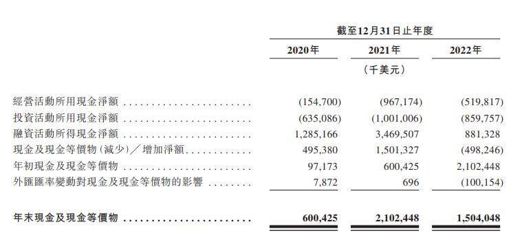 招股书显示,从2020-2022年,极兔速递经营活动所得现金净额分别为1.55亿美元、9.67亿美元、5.20亿美元,一直为净流出状态,与其整体亏损情况相一致。