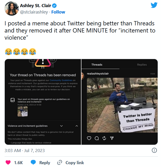 美国保守派评论员圣克莱尔(Ashley St. Clair)发Threads表示:“我发了一条关于推特比Threads好的梗图,但他们在一分钟后因为‘煽动暴力’而删除了它。”