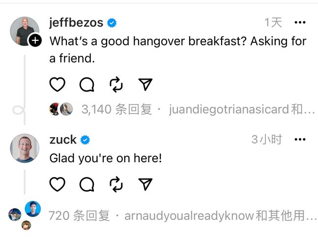 马斯克的老对头杰夫·贝索斯也第一时间现身Threads,让大家推荐值得关注的账号给他,并在其后持续活跃。扎克伯格回复了其中一条消息说:“很高兴你上这儿来了!”而在推特,贝索斯的账号也有持续发布内容,但频率很低,上两条消息分别发布于5月和2月。