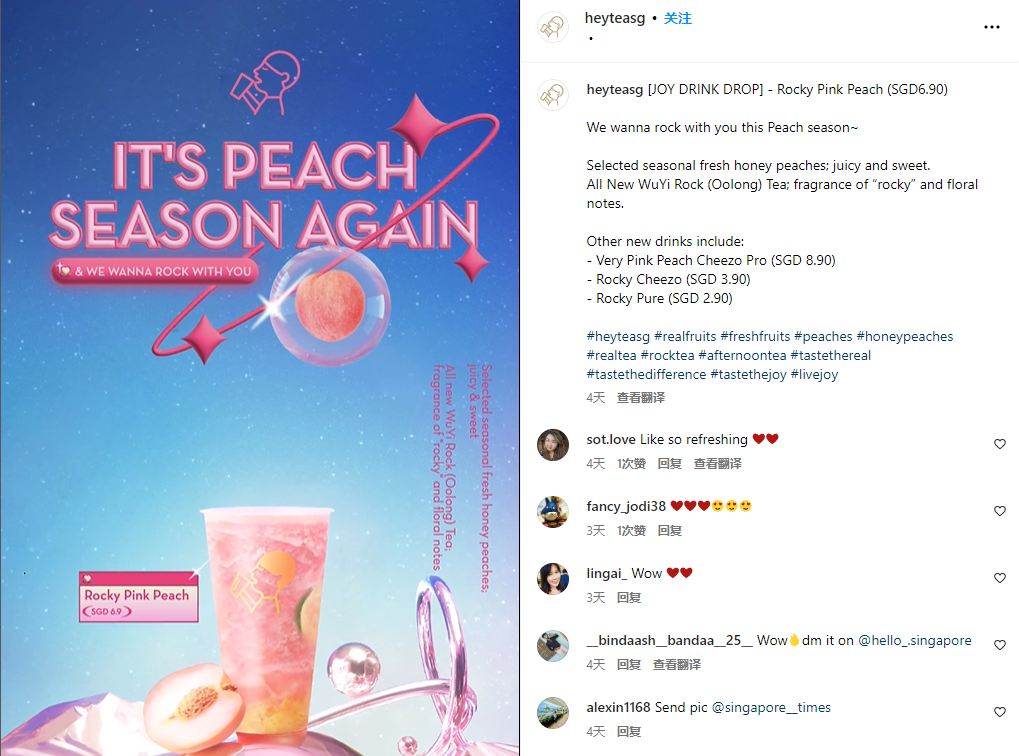 在营销方面,注重“线上+线下”“体验+社交”的模式,是新茶饮品牌优势所在。比如,选择“直营+社交”,为喜茶在海外市场打造高端品牌形象提供了助力。在新加坡,喜茶通过开设官方Facebook和Instagram账号,合作当地KOL,以及与粉丝互动,实现了区别于传统硬广的推广效果。