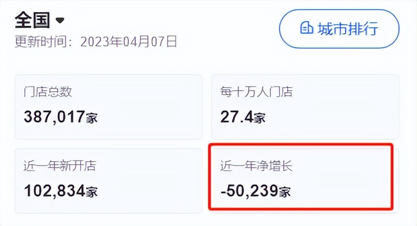 其一,国内市场增长空间越来越窄。国内市场规模增速放缓。红餐大数据显示,2015年到2021年,我国现制茶饮市场规模从422亿元增长到1419亿元,增速迅猛,但是,从2022年或者更早开始,市场增速已经在走下坡路。2022年,现制茶饮市场规模为1423亿元,相比2021年仅增长0.3%。同时,近一年门店数量走向拟增资。据窄门餐眼数据,截至4月7日,新茶饮近一年门店净增长为负5万多家。