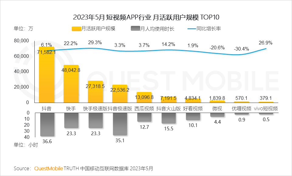 QuestMobile数据显示,截止到2023年5月,全网12亿用户日均使用时长达7.1小时,较2019年提升了1.3小时,这当中,随着5G通信和手机终端性能的提升,内容、社交视频化趋势已成主流形态,用户使用总时长占比中短视频稳居第一达到28%,移动视频行业整体用户规模达到10.76亿,月人均时长达到64.2小时,视频平台将用户引向电商、音乐、影视、本地生活、旅游服务等等垂直赛道……